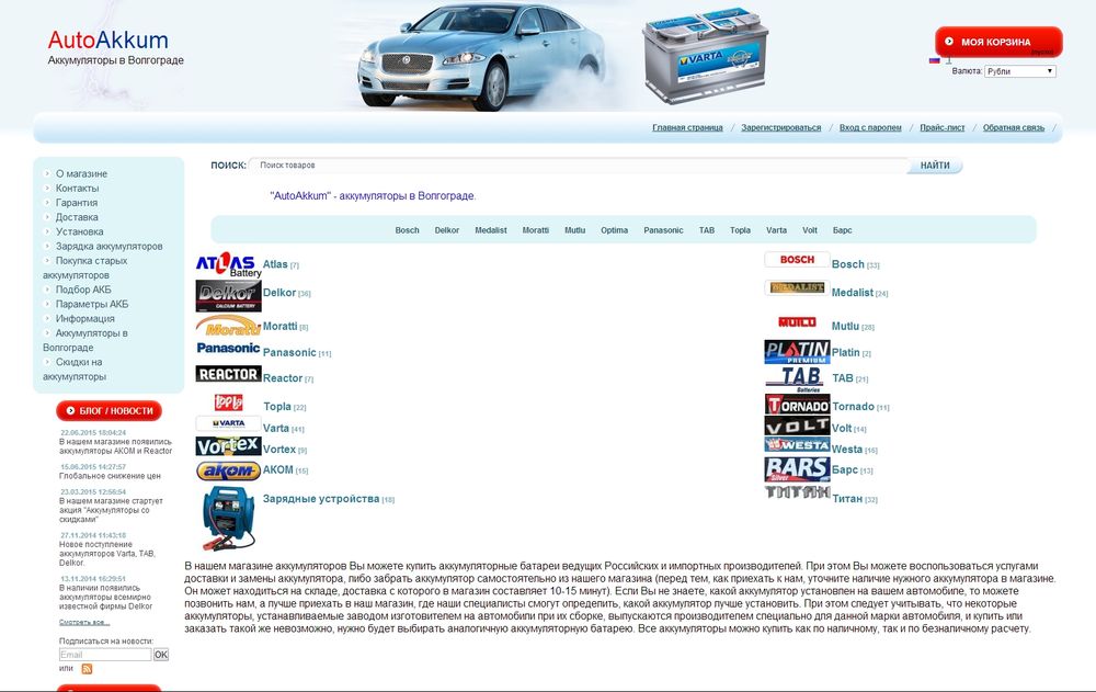 Запчасти, оборудованиеAutoakkum - автомобильные аккумуляторы в Волгограде.Россия - ВолгоградИнтернет-магазин AutoAkkum занимается розничной и оптовой продажей автомобильных аккумуляторов Bosch, Varta, Medalist, American, Mutlu, Japan Star, Optima, Docker, Vortex, Westa, Титан, Барс. Мы предлагаем широкий ассортимент аккумуляторов для легковых и грузовых автомобилей, спецтехники, погрузчиков, катеров, мотоциклов, генераторных установок и т.д.